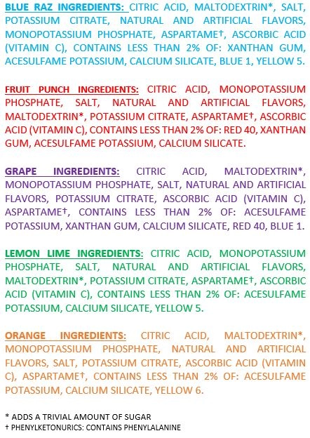 - Flavors: Blue Raz, Fruit Punch, Lemon Lime, Grape, Orange