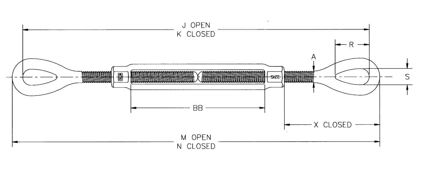• Turnbuckle eyes are forged and elongated, by design, to maximize easy attachment in system and minimize stress in the eye. For turnbuckle sizes 1/4” through 2 1/2”, a shackle one size smaller can be reeved through eye.