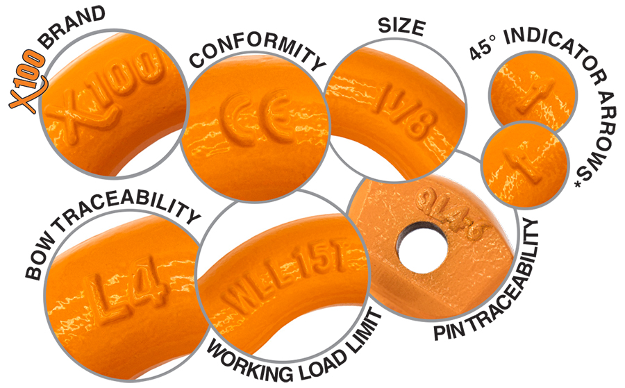 • Markings: X100 Brand, Size, Working Load Limit, Conformity, Traceability, 45° Indicator Arrows*